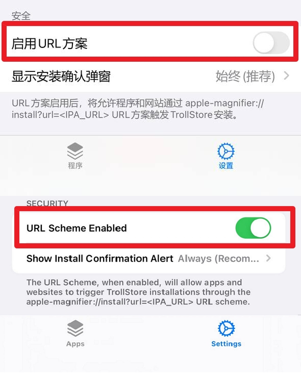TrollStore(巨魔)安装,如果你点击 TrollStore(巨魔) 按钮后打开的是 Apple的放大镜是因为如下原因:你的 TrollStore 版本号小于1.3+版本,建议直接更新到最新版,你的使用 URL 方案没有启用,若启用后记得点击第一个选项立即注销生效 (Rebuild Now)